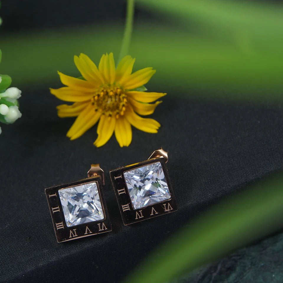 Stainless Steel Rosegold Plated Square Shaped Roman Numerals Stud Earring